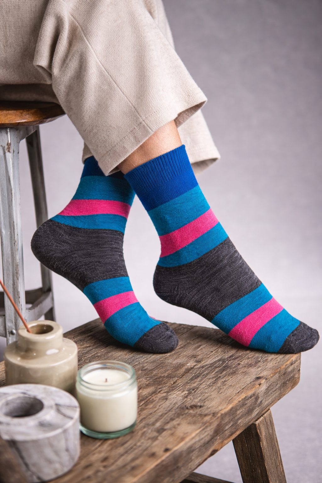 Twisted accents and diagonal patterns are the basics of the many landscapes of this feminine sock. Our lightweight blend of Baby Alpaca, Merino and Bamboo offers great comfort in every season. The luxurious softness and balanced thermal insulation of these socks provide modern style, warmth, and dryness all day long.