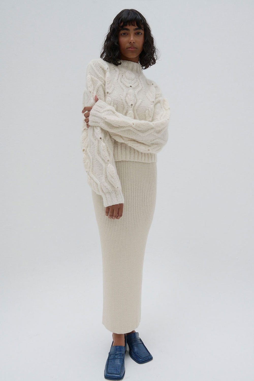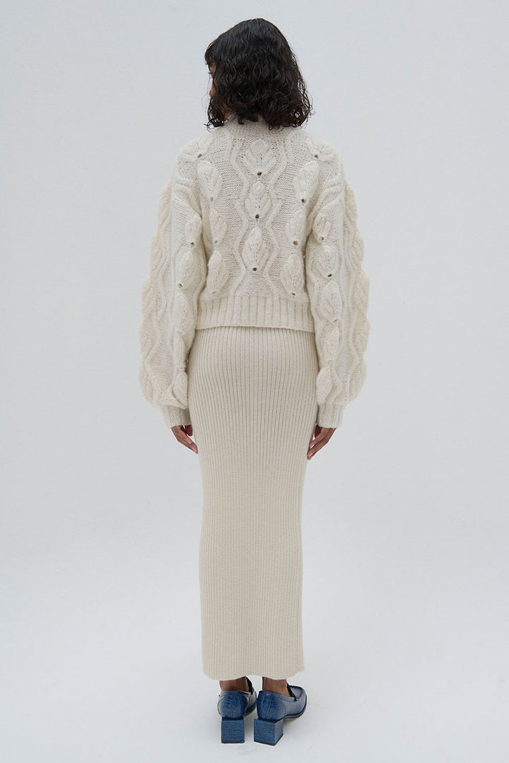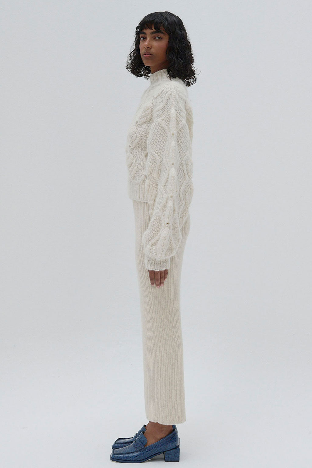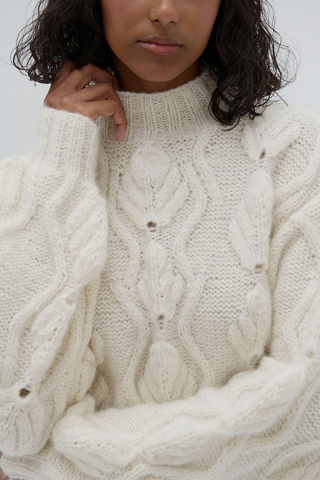 Dieser stilvolle Pullover verkörpert mit seinem handgestrickten, strukturierten Design Eleganz. Dieses luxuriöse Stück aus Babyalpaka und Merinowolle verfügt über einen hohen Rollkragen, der für eine bequeme, elegante Passform sorgt. Das aufwendige, von der Natur inspirierte Zopfmuster schlängelt sich wunderschön über den Körper und verleiht sowohl Tiefe als auch Struktur. Sein sanfter Elfenbeinton ergänzt die übergroßen Ballonärmel, die mit auffälligen Zopfmustern versehen sind und dem Pullover ein opulentes und dennoch gemütliches Gefühl verleihen. Der verkürzte Saum macht ihn zu einem vielseitigen Stück, das sowohl zu maßgeschneiderten als auch zu lässigen Outfits getragen werden kann.