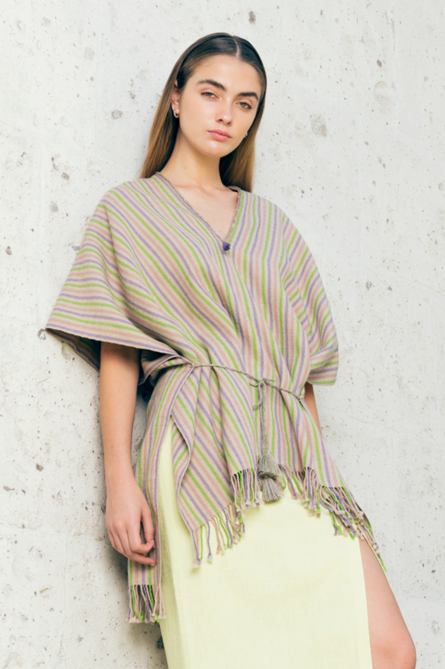 This Organic Cotton Poncho is 100% handmade and woven in an artisan loom. It comes in a striped pattern and features a flattering V-neck cut that cascades into an airy drape. The design was reinvented and now includes adjustable ties that allow you to customize the fit. Cinch it in for a slimmer silhouette or leave it loose to use it as a swimwear cover-up.