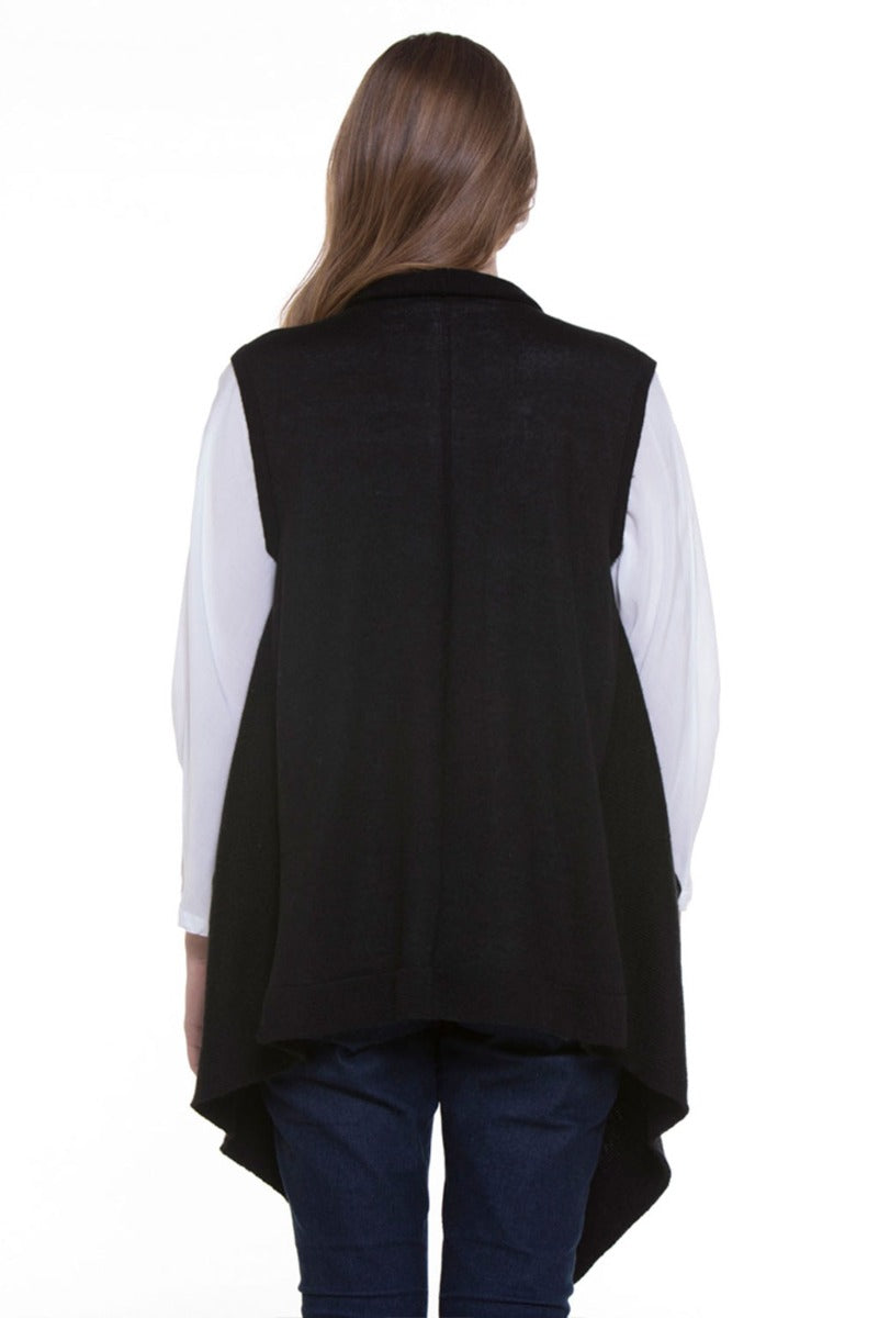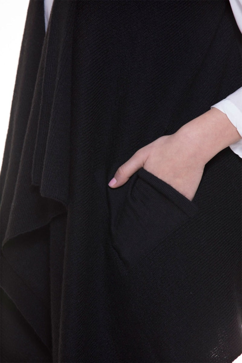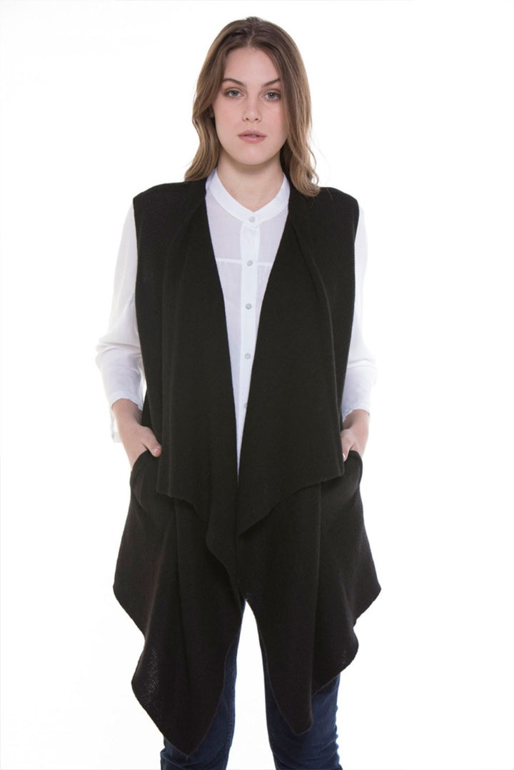 Weste aus 100 % Cashllama mit offener Vorderseite, übergroßem Revers, kurzem Rücken und schrägen Taschen. Schmeichelhafter Schnitt, vielseitig und sehr bequem.