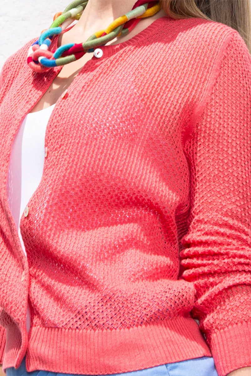 Diese gemütliche Strickjacke aus 100 % Bio-Baumwolle hat lange Ärmel und ist perfekt für die Übergangszeit. Das zarte und feine Strickmuster ähnelt feiner Spitze. Dennoch behält sie einen modernen und zeitgenössischen Charakter und ist daher vielseitig für verschiedene Anlässe geeignet. Die gerippten Bündchen und der Saum sorgen für eine bequeme Passform und verleihen dem Design Struktur.