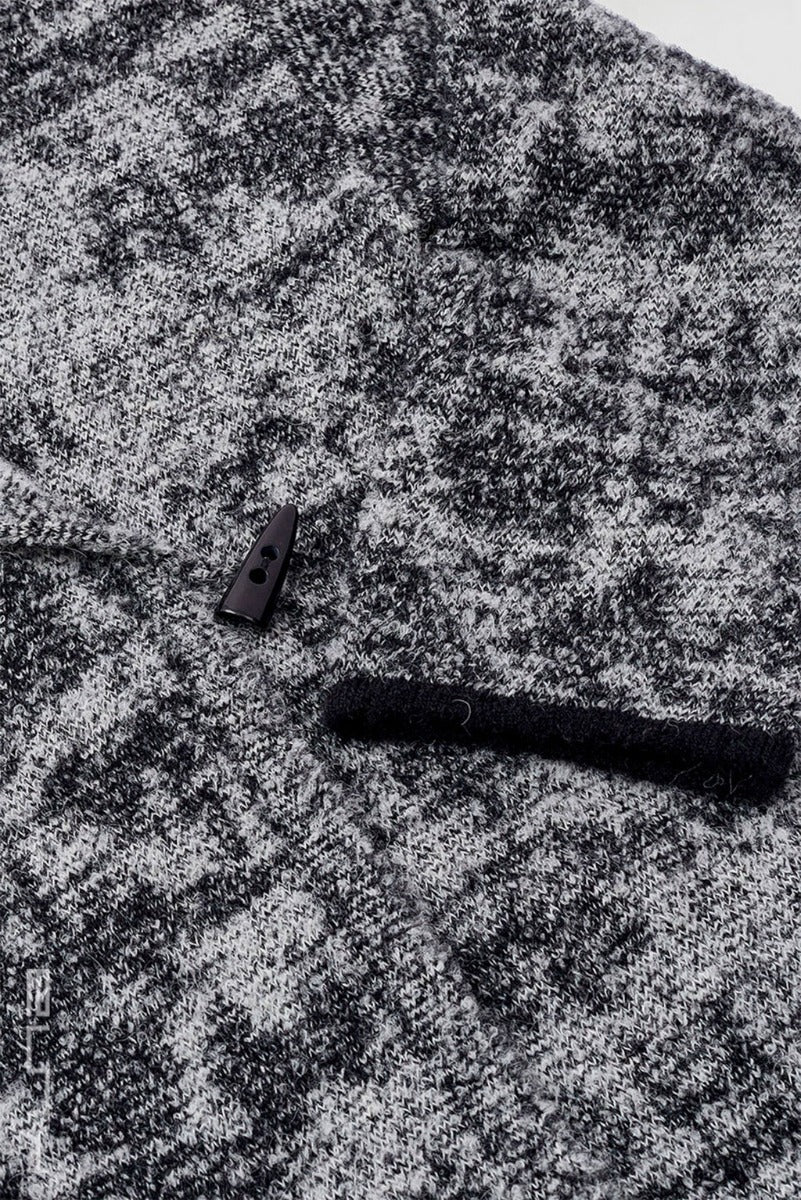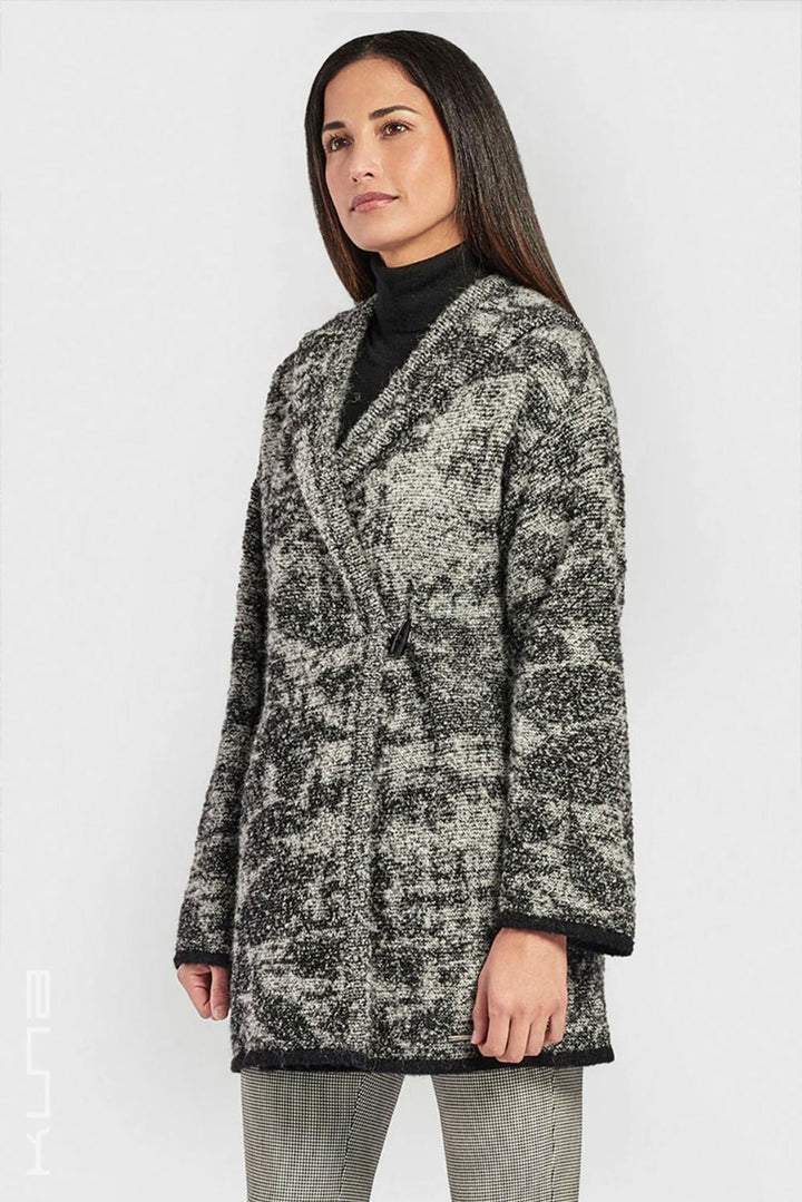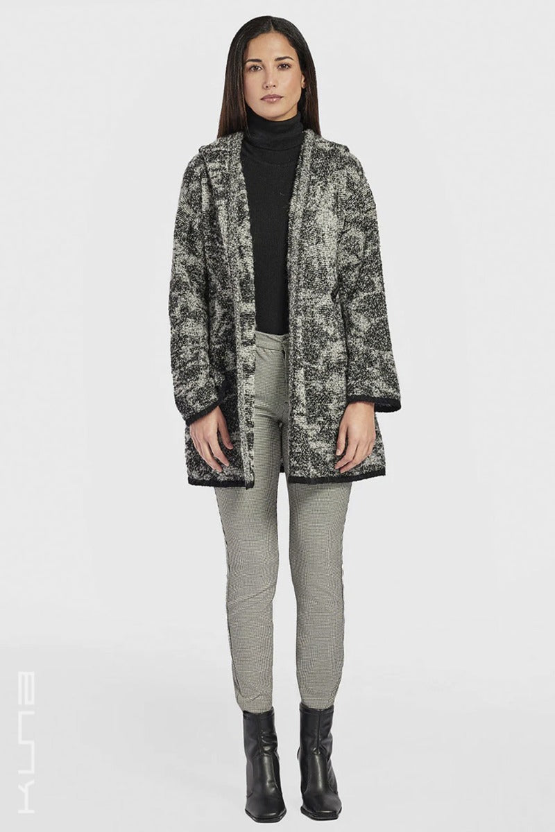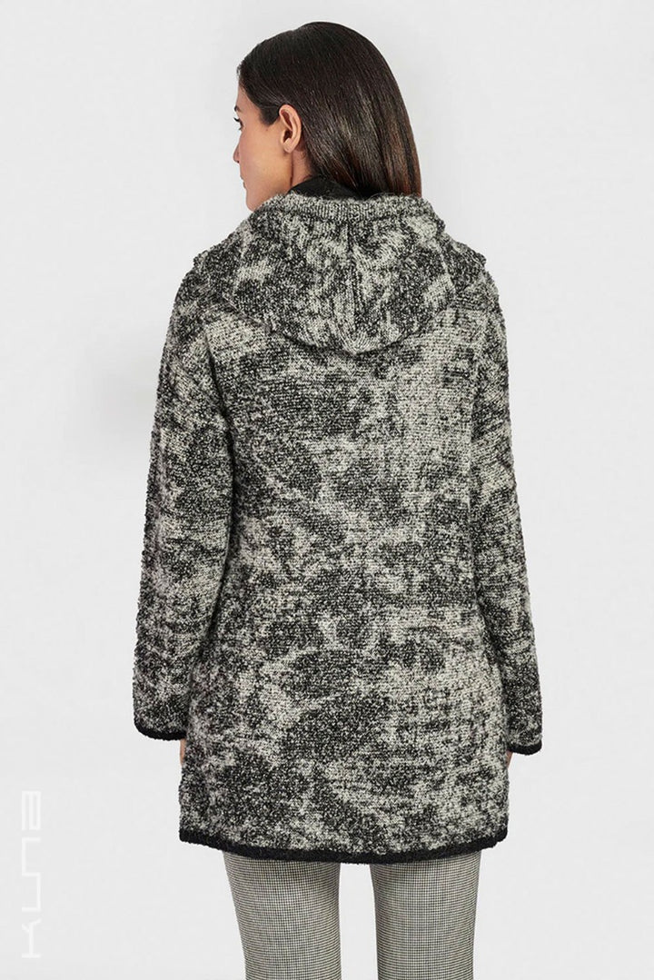 Gemütliche Strickjacke mit Kapuze aus Alpakagarn im Bouclé-Stil in einem stilvollen schwarz-grauen Druck. Eine tolle, gemütliche Strickjacke, die Sie das ganze Jahr über tragen können.