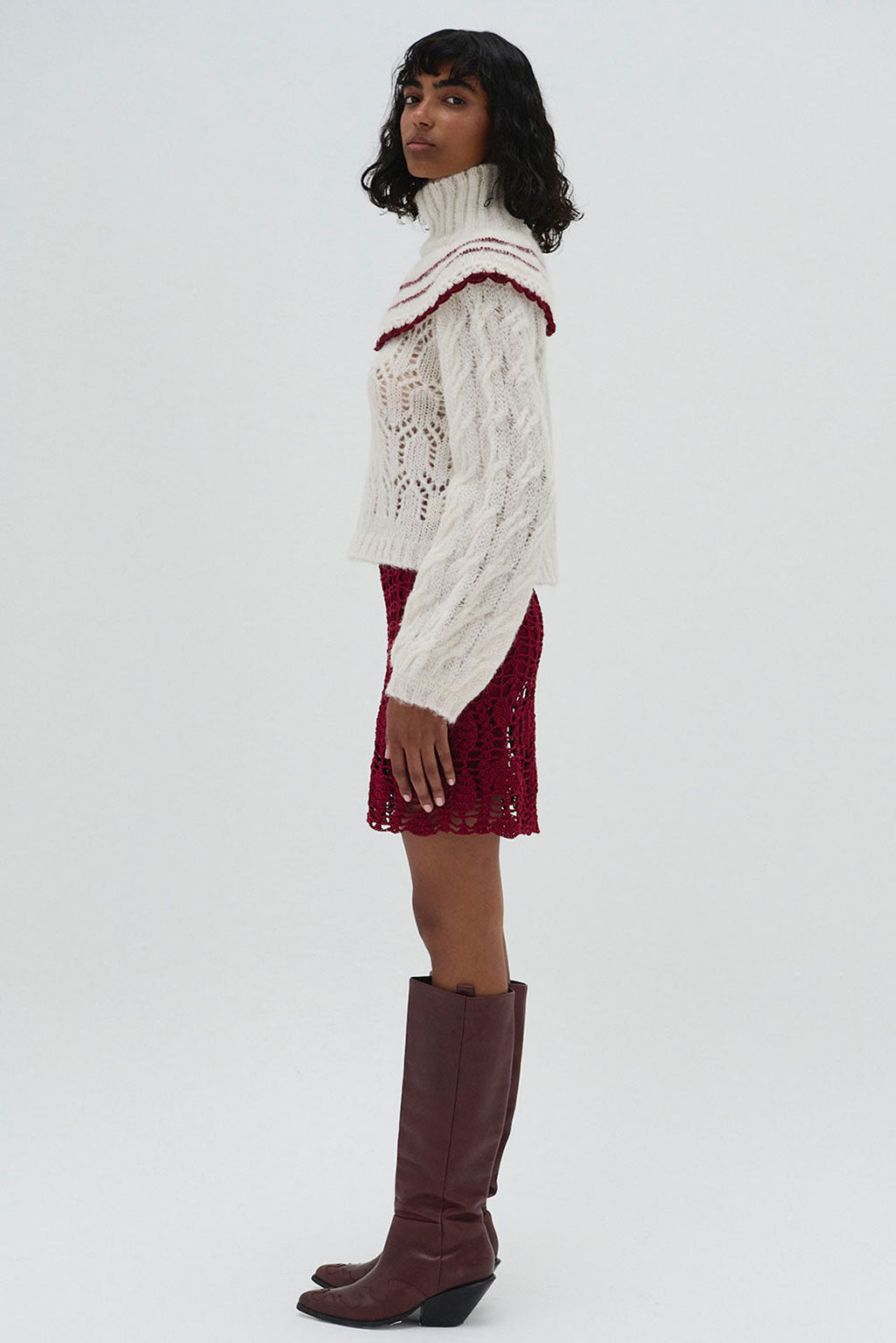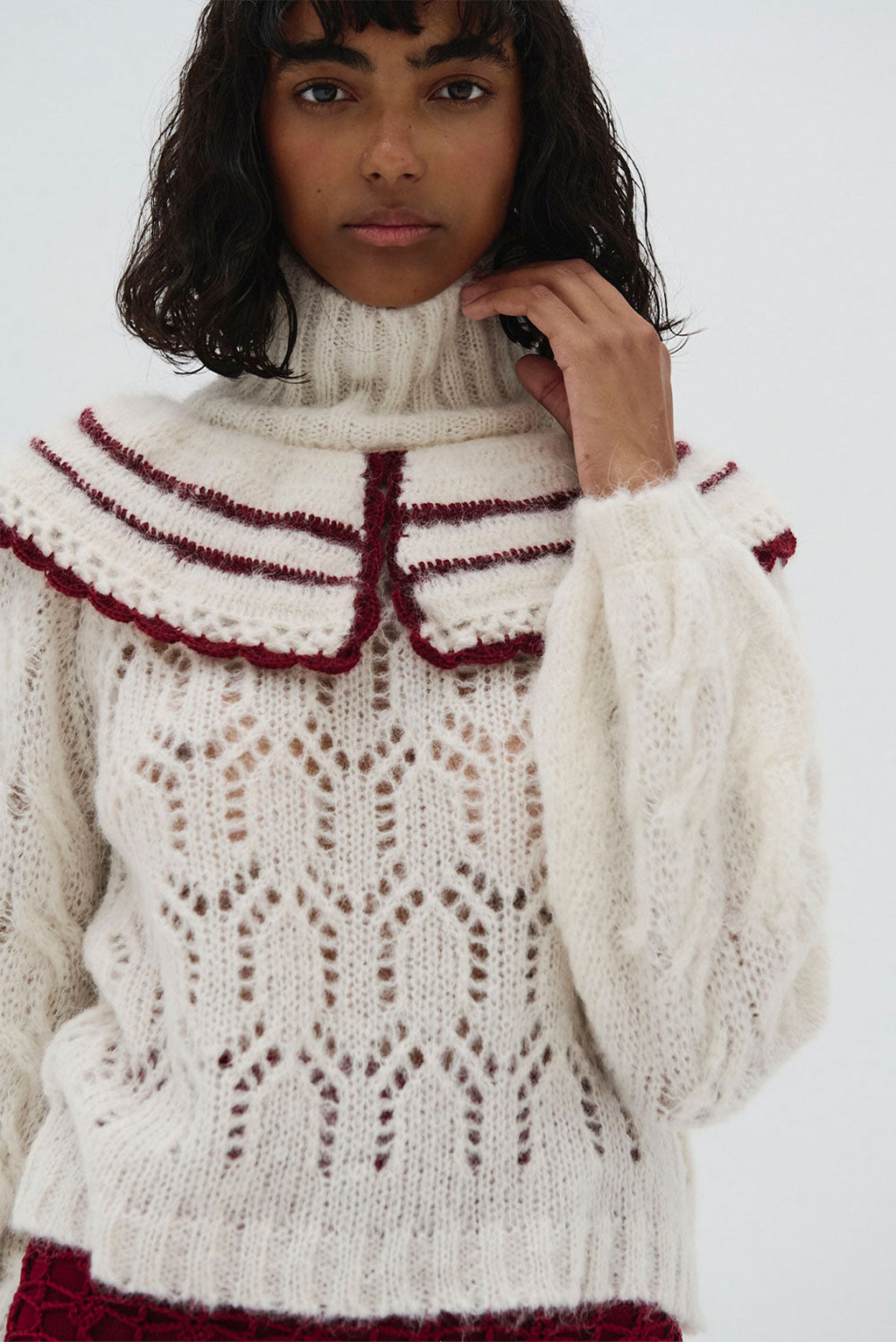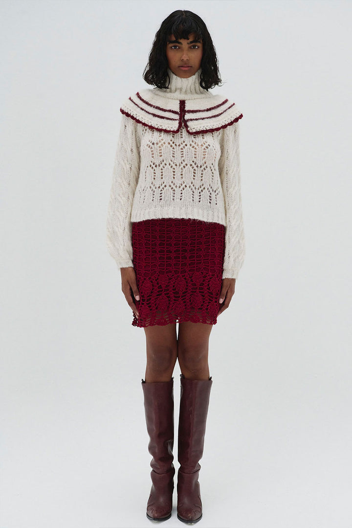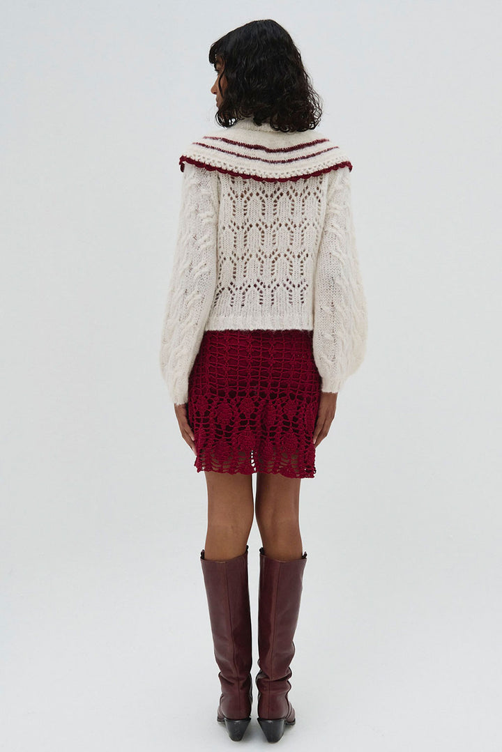 This striking white alpaca sweater features a delicate lace-knit pattern paired with a bold, cape-like design. The burgundy stripes add a dramatic contrast to the soft, airy knit, while the high neckline and voluminous sleeves offer a structured, fashionable look. It’s a blend of classic elegance with modern boho influences, perfect for adding a statement to your wardrobe. The natural softness of alpaca paired with the durability of cotton ensures warmth, breathability, and a unique textured feel.