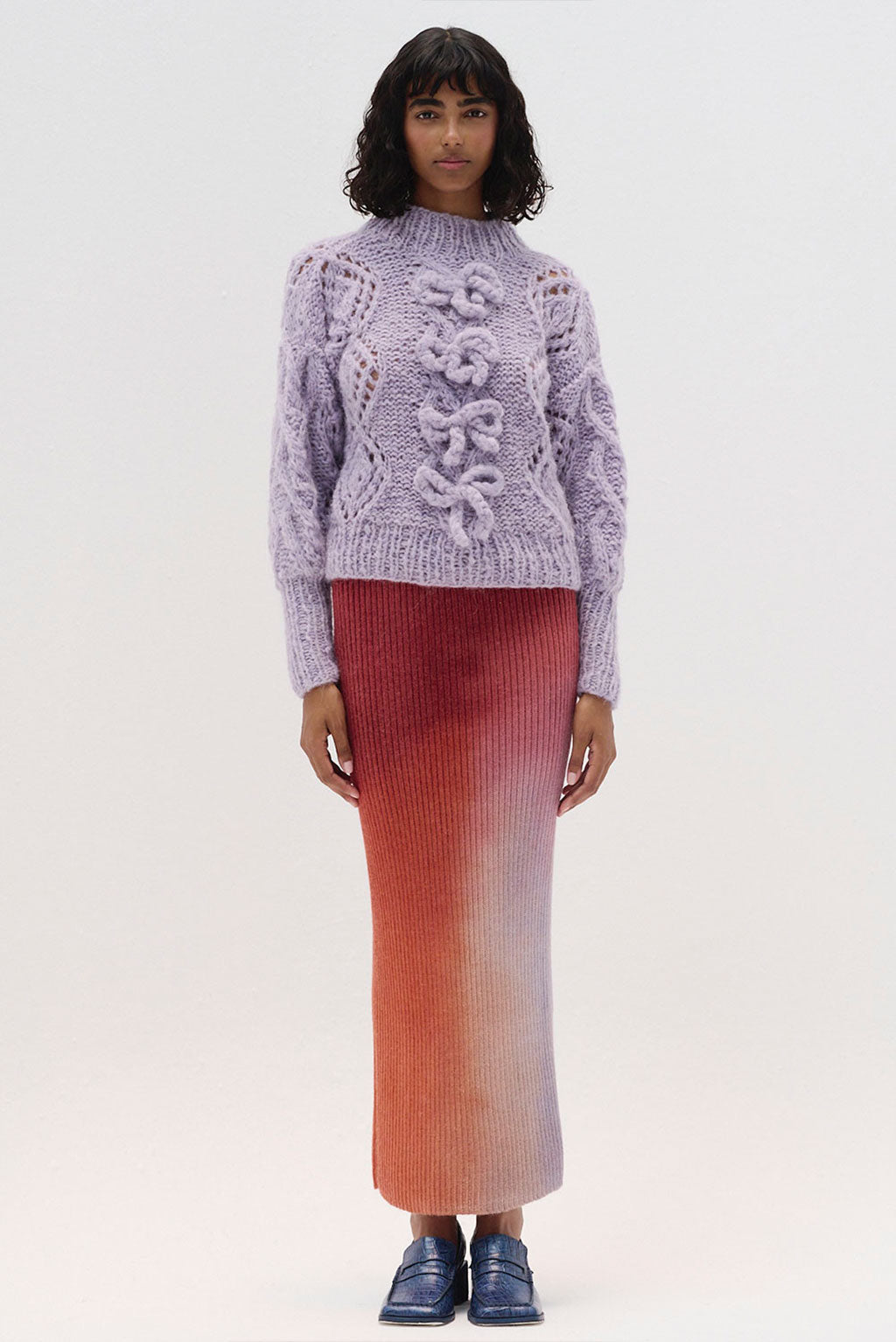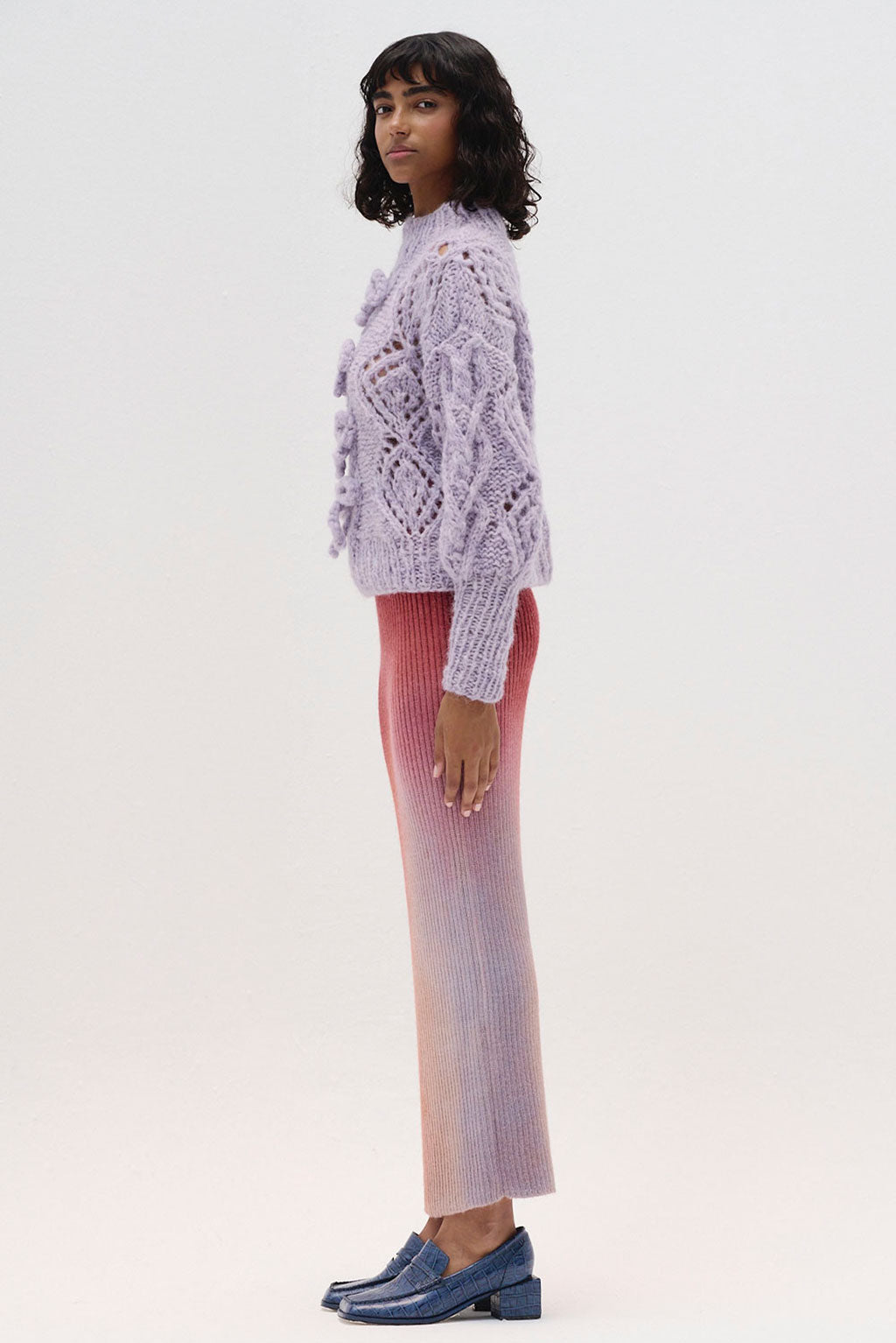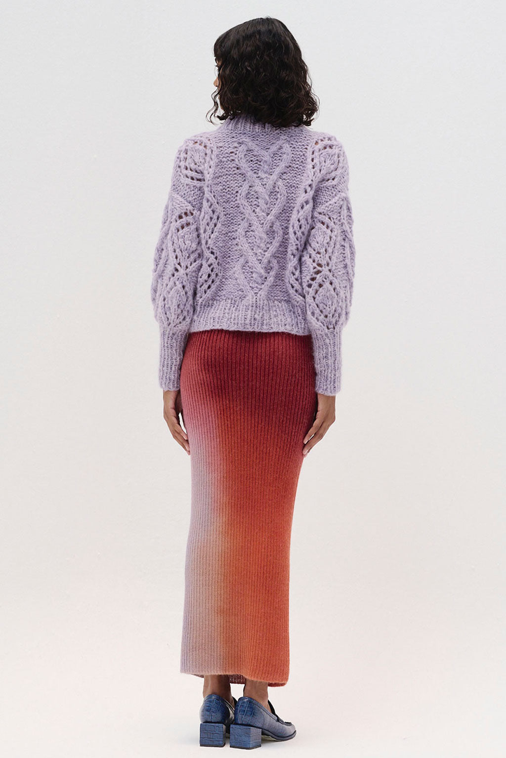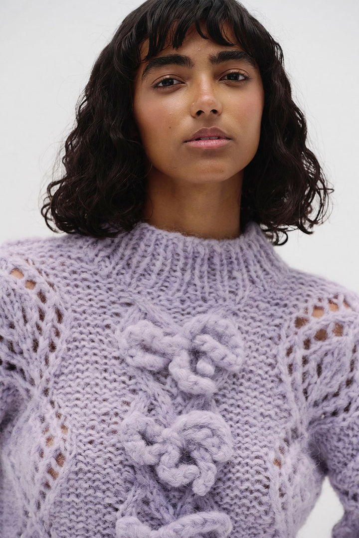 This hand-knit lavender sweater is a cozy and stylish option for winter and fall. Featuring a high crew neckline, this chunky cable-knit alpaca sweater offers warmth and comfort, while the intricate braided design down the front adds a touch of craftsmanship. The lace-like open-knit sleeves paired with voluminous balloon sleeves make it an eye-catching piece. With a relaxed, slightly cropped fit, this wool-blend sweater is perfect for layering over high-waisted jeans or skirts during colder months.