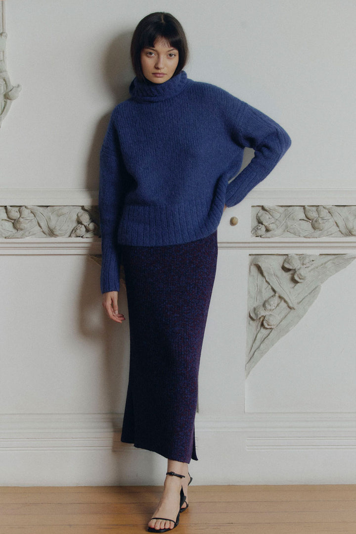 This elegant pullover crafted from a luxurious blend of Suri alpaca, Peruvian pima cotton, and Merino wool features a turtleneck and a relaxed silhouette, offering both comfort and effortless elegance. The design showcases dropped shoulders and ribbed details at the hem and cuffs, enhancing the snug fit. The deep blue tone adds a touch of sophistication. It provides warmth while being luxuriously soft to the touch.