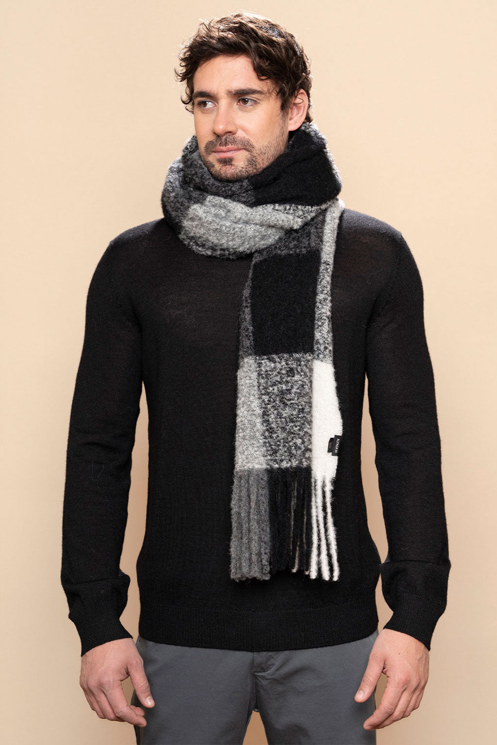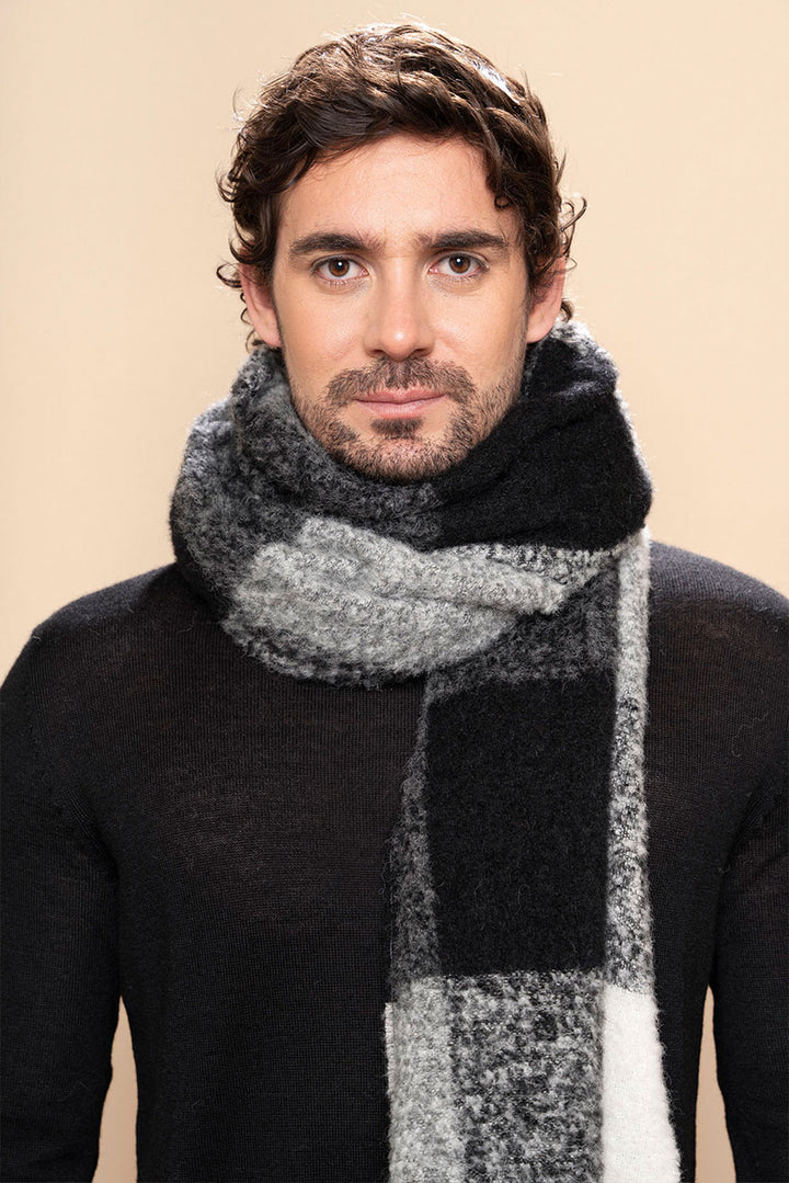 Gear up for the cold with our Plaid Chunky Alpaca Scarf. Featuring a bold checkered pattern in black, white, and shades of gray, this scarf makes a strong statement. Its thick, robust texture provides comfort and warmth on even the coldest days. The fringed ends add a rugged touch, making this scarf a standout addition to any outfit.