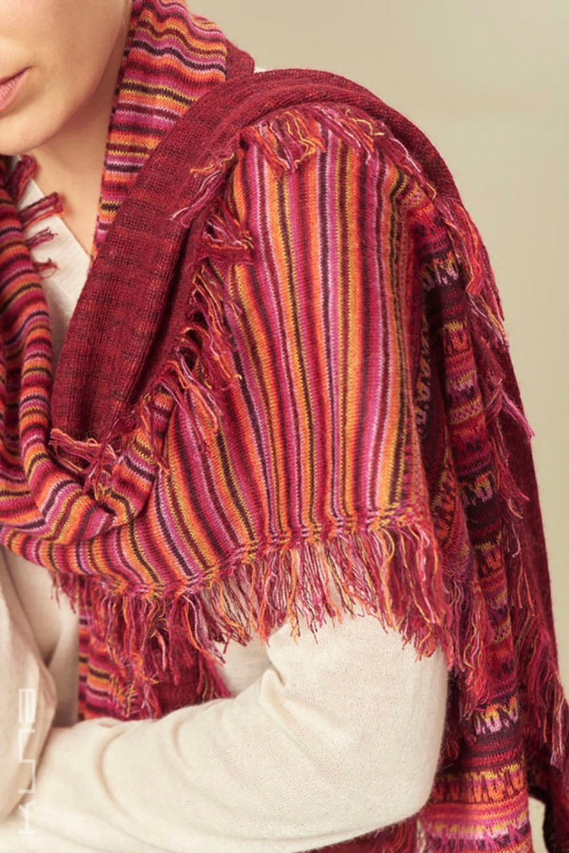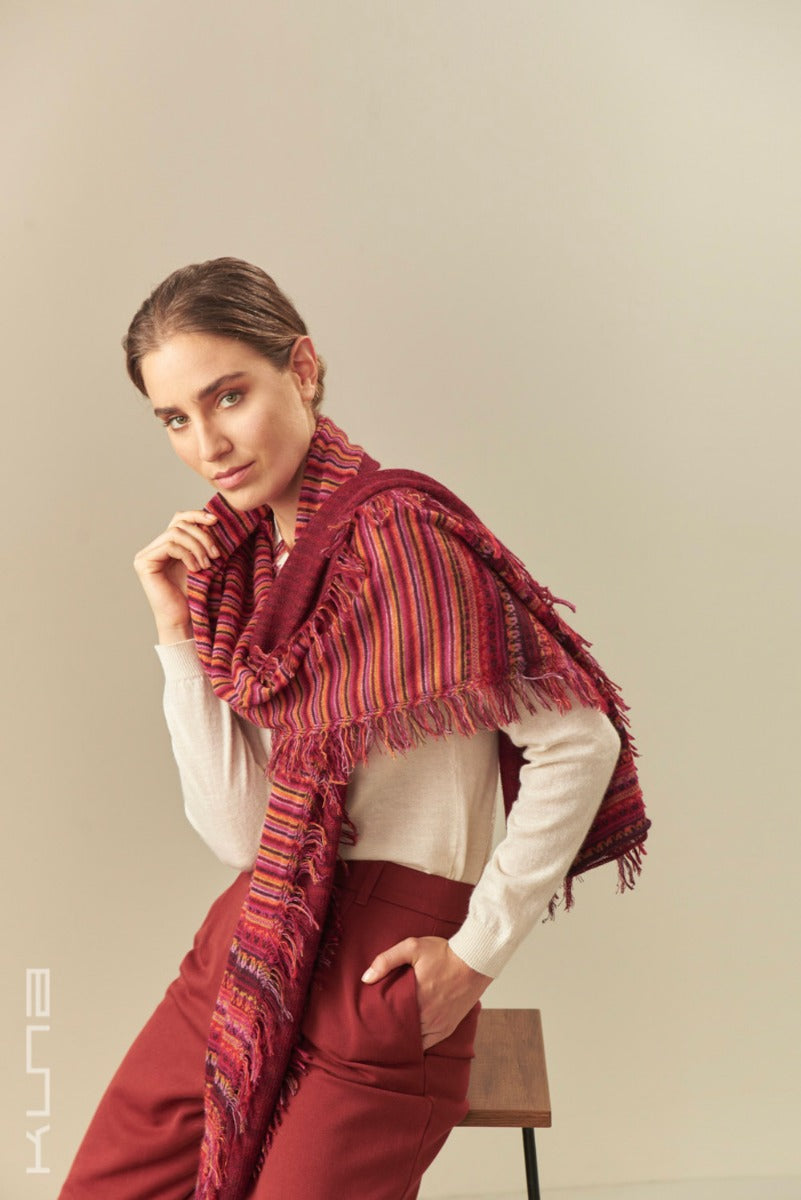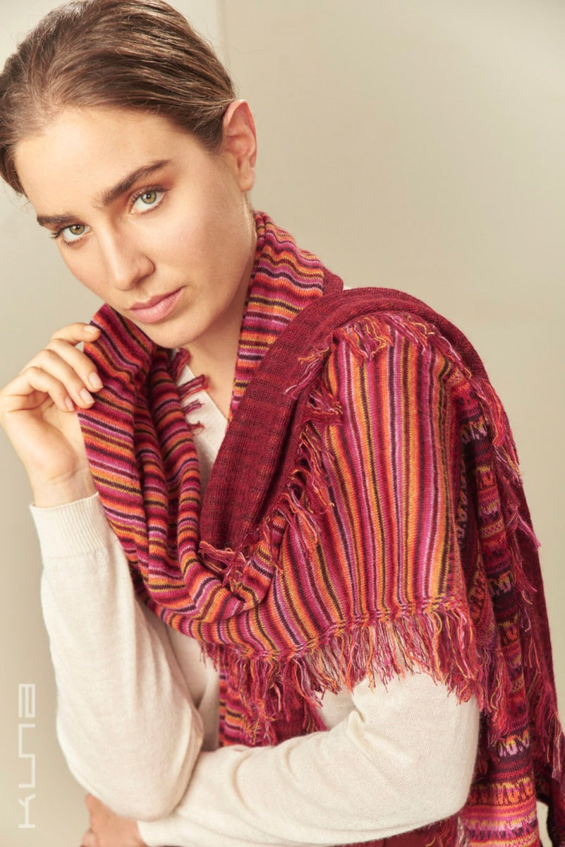 Beautiful 100% Baby Alpaca Scarf. This is a variation of our standard Baby Alpaca scarves - it has horizontal fringes that run along the length of the scarf with a combination of cheerful tones.