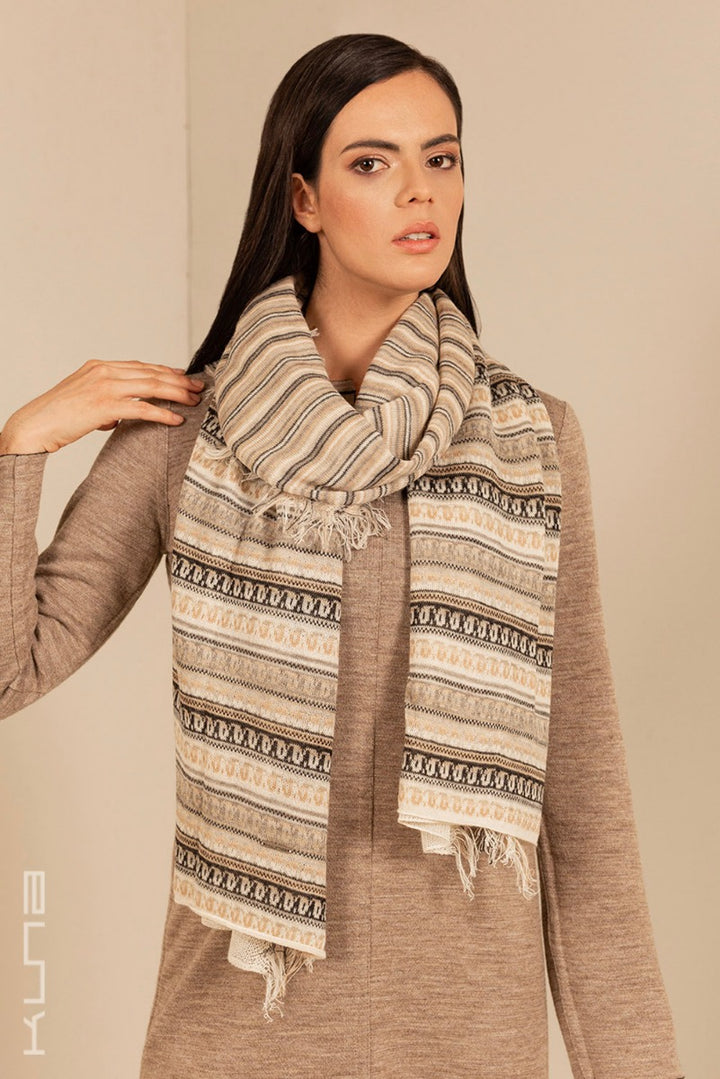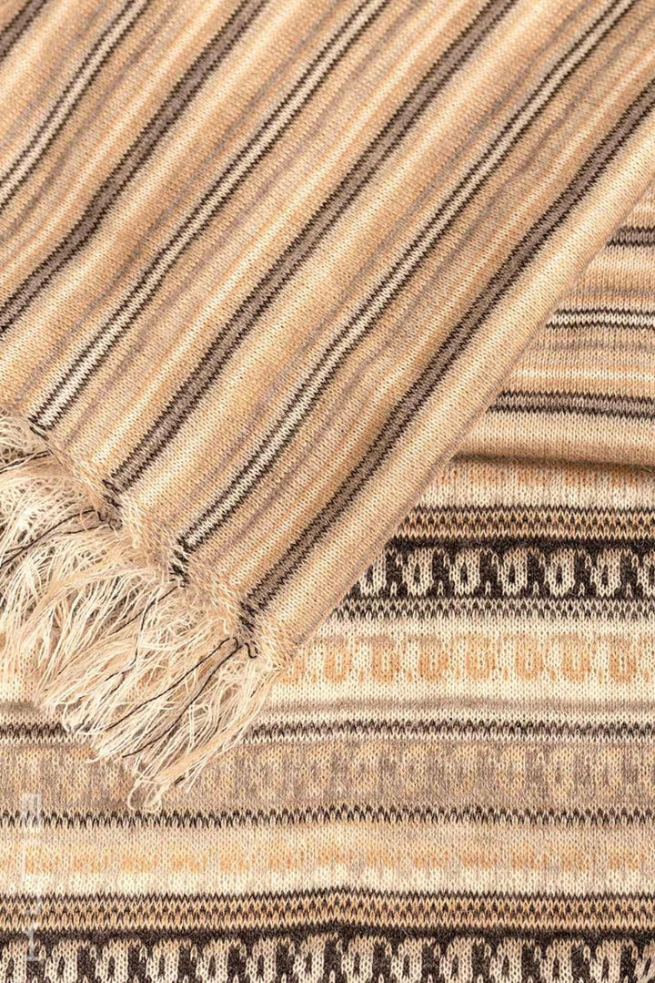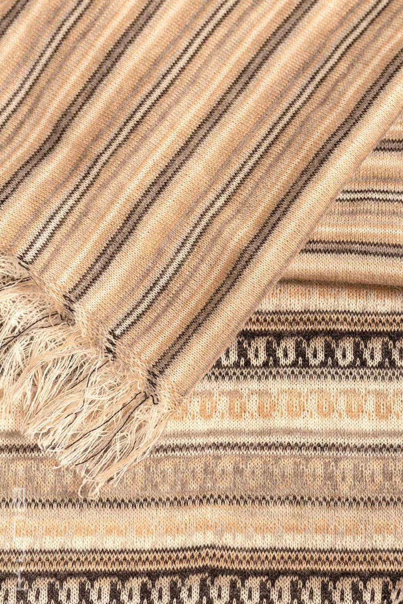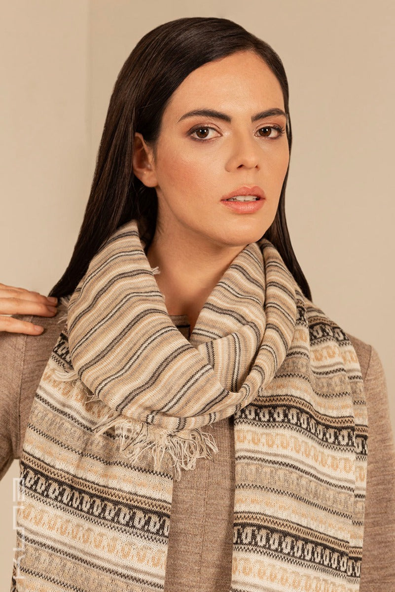 Beautiful 100% Baby Alpaca Scarf. This is a variation of our standard Baby Alpaca scarves - it has horizontal fringes that run along the length of the scarf with a combination of cheerful tones.