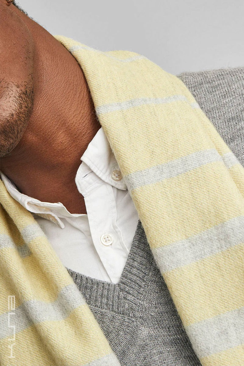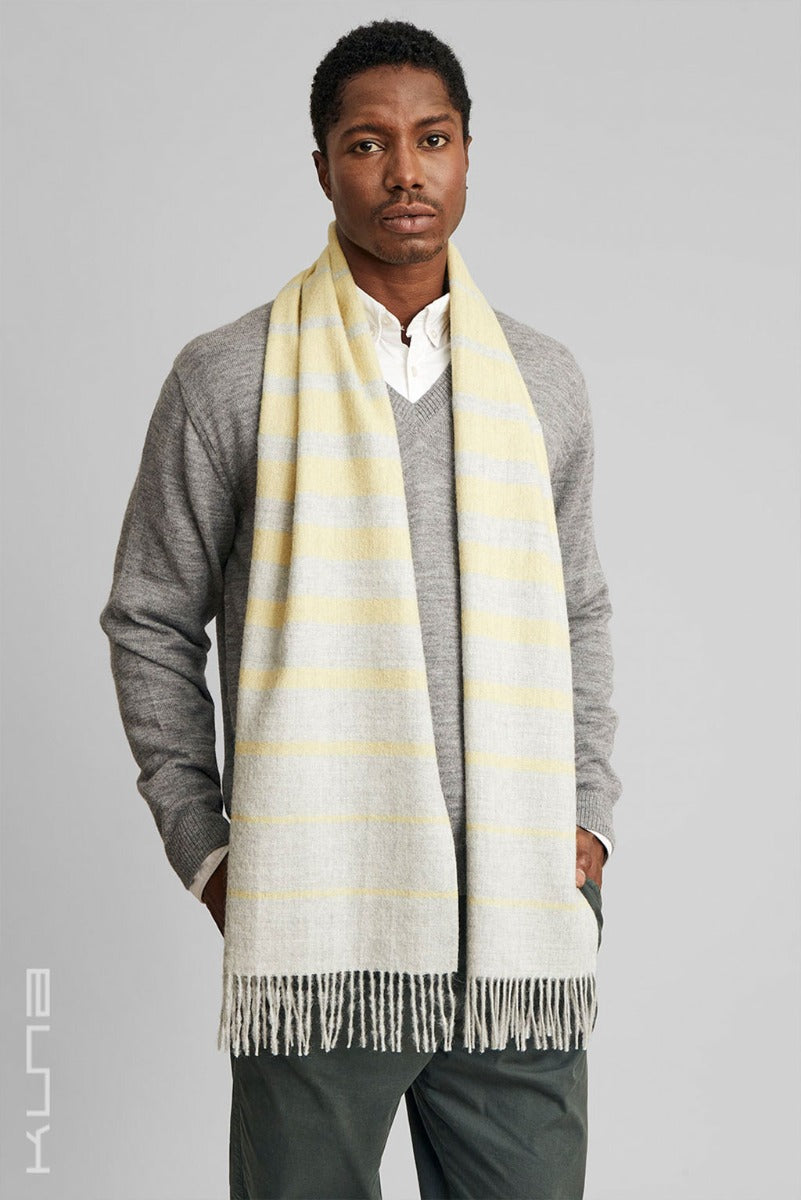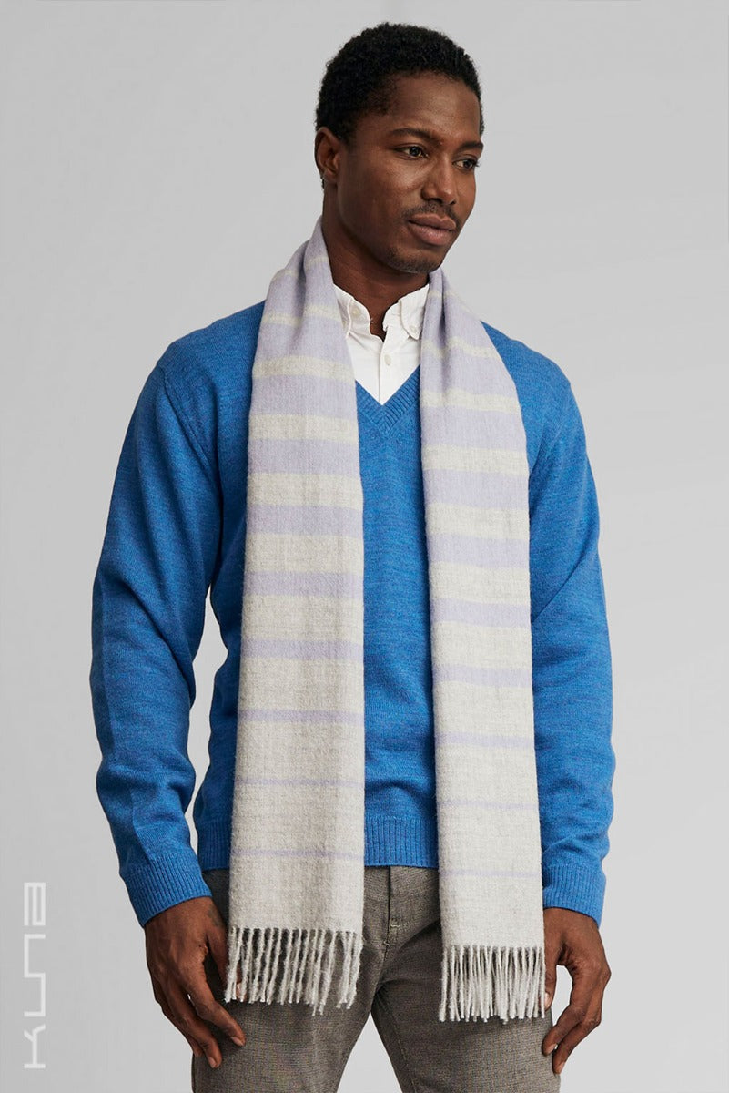 Crafted from the finest baby alpaca fiber, the Tadeo Baby Alpaca Scarf combines softness and style and effortlessly elevates any ensemble while providing cozy warmth. The dual-tone design and the horizontal stripes, create a serene and sophisticated look. Delicate fringes adorn the scarf’s ends, adding a classic touch.