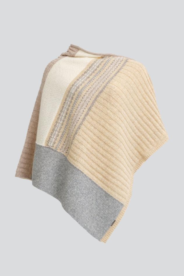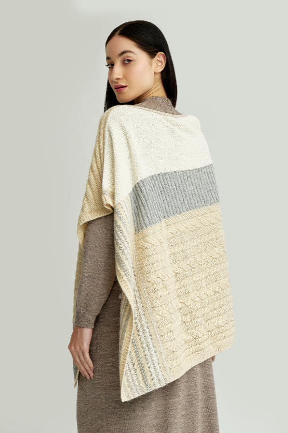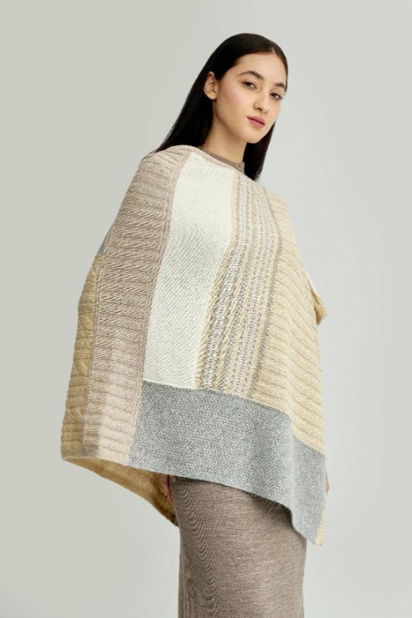 Introducing the luxurious Ysadora Baby Alpaca Poncho. Crafted from the finest baby alpaca wool, this poncho offers exceptional warmth. Its design features a beautiful blend of neutral colors and an intricate ribbed pattern, giving it a sophisticated and stylish appearance. The asymmetrical design and various knitting styles add a unique flair, making it a versatile addition to any wardrobe.